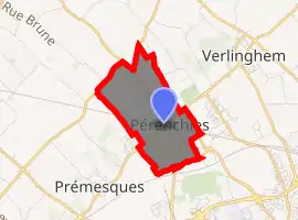 The arms of Pérenchies are blazoned : Vert, an inescutcheon argent, overall a bend compony gules and argent. |
