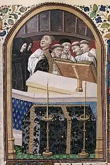 Most of Pérotin's works are in polyphonic form of discant, including the quadrupla and tripla. Here the upper voices move in discant, as rhythmic counterpoint above the sustained tenor notes. This is consistent with Anonymous IV's description of him as optimus discantor. However, like Léonin, he is likely to have composed in every musical genre and style known to Notre Dame polyphony.[17] Pérotin's dates of activity have been approximated from some late 12th century edicts (Statuta et donationes piae)[49] of the Bishop of Paris, Odo (Eudes de Sully)[lower-alpha 17] (1196–1208), in 1198 and 1199. Rebuked by Pierre de Capuano, the papal legate of the time, the bishop sought to reform the rituals around the Christmas season, forbidding the boistrous costumed performances that existed at the time, in particular, the Feast of Fools.[50] His preference was for elaborate music in its stead,[37][51] calling for performance in organa triplo vel quadruplo for the Responsory and Benedicamus and other settings.[lower-alpha 18][30] The bishop's edicts are quite specific, and suggest that Pérotin's organum quadruplum Viderunt omnes was written for Christmas 1198, and his other organum quadruplum Sederunt Principes was composed for Saint Stephen's Day 1199, for the dedication of a new wing of the Notre Dame Cathedral.[lower-alpha 19] If written after this, they could not have been written till late 1200 or 1201, since for most of 1200 France lay under an interdict of Pope Innocent III which suppressed the celebration of church services.[54] Hans Tischler dates the revision of the Magnus Liber to around 1180/90.[16] Between the accounts of Anonymous IV, the episcopal edicts and the arrangements in the Magnus liber, the key compositions appear to be corroborated and assigned to this period.[37]