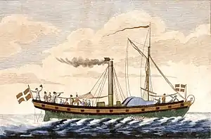In May 1817 the Caledonia was bought by James Watt Jr (nephew of the inventor James Watt) and Matthew Robinson Boulton (son of Matthew Boulton). The new owners worked together as second generation of the engine factory of Boulton and Watt and they had plans to add ship engines to their production in Birmingham at Soho Manufactory. Watts and Boulton gradually replaced the machinery with their own products, and in order to test the endurance they took the Caledonia on a trip to Rotterdam and up the Rhine. The sidewheeler Defiance had gone as far as Cologne in June 1816,[5] and the Caledonia reached Koblenz in November 1817. It had, however, been necessary to use draft horses on the final part, and when the owners asked the Kingdom of Prussia for a concession for a regular service, their request was refused.[6] Caledonia spent the winter at Rotterdam, and more machine parts were delivered from England for installation. In the spring of 1818, the sidewheeler was back on the Thames, and James Watt Junior continued his experiments, among other things varying the number of paddles on each wheel. While this was happening, the Danish solicitor, and later diplomat, Steen Andersen Bille (1781-1860), had petitioned the Danish King for the exclusive concession for a steamship connection between Copenhagen and Kiel in Holstein (then a part of the Danish Monarchy). There were two other applicants for the concession, but both withdrew, and in October 1818 Bille's concession was confirmed. He wanted to buy the Caledonia, but at the time he worked as an administrator in the Danish West Indies, so the bankers Hambro and Son in Copenhagen (later Hambros Bank in London) took care of the purchase. Steen Bille's brother, the naval officer Michael Bille travelled to England, where he took over the Caledonia and led the ship to Denmark by the Eider Canal.[7]