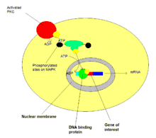 Protein kinase C (PKC) is a family of serine- and threonine-specific protein kinases that can be activated by calcium and the second messenger diacylglycerol. PKC family members phosphorylate a wide variety of protein targets and are known to be involved in diverse cellular signaling pathways. PKC family members also serve as major receptors for phorbol esters, a class of tumor promoters. Each member of the PKC family has a specific expression profile and is believed to play a distinct role in cells. The protein encoded by this gene is one of the PKC family members. This kinase has been reported to play roles in many different cellular processes, such as cell adhesion, cell transformation, cell cycle checkpoint, and cell volume control. Knockout studies in mice suggest that this kinase may be a fundamental regulator of cardiac contractility and Ca2+ handling in myocytes.[5]