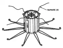 Once the mine is scattered, the top is ejected, allowing the spring-loaded legs to fold down. Also four tripwires are launched away from the mine. After a short period the mine is armed, from that point on, any disturbance of the trip wires will trigger the mine, scattering fragments to a lethal radius of approximately 15 meters.