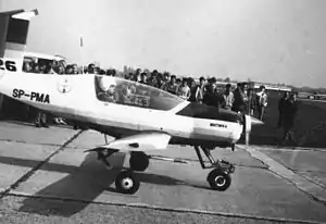 The PZL-126 Mrówka (ant) is a Polish agricultural aircraft first flown in 1990. It is a diminutive low-wing monoplane of conventional if stubby appearance with a cruciform tail, an enclosed cabin and fixed, tricycle undercarriage. Significant parts of the design were undertaken by students at the training college attached to the PZL plant at Okęcie under the direction of Andrzej Słocinski,[1] with the whole project treated initially as a platform for design innovation.[2] Initial design work was completed in 1982 and detail work the following year.[3] Plans to fly a prototype by 1985 were delayed by revisions to the aircraft's equipment, although a mockup was displayed at an agricultural aviation exhibition at Olsztyn that August.[3] Legislation to outlaw certain agricultural chemicals was under consideration in Poland in the late 1980s, spurring interest in biological agents as an alternative and making a tiny aircraft like the Mrówka feasible as a useful piece of agricultural equipment.[2]