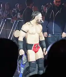 On 18 December at Roadblock: End of the Line, Neville returned to seemingly congratulate Cruiserweight Champion Rich Swann after his match only to attack Swann and his opponent TJ Perkins, turning heel for the first time in his WWE career and joining the Cruiserweight division.[86] The following night on Raw, Neville cemented his villainous turn after claiming that the fans only cheered him because he was "vulnerable or small" and proceeded to attack Swann along with Brian Kendrick after he interrupted him, followed by Perkins after he attempted to save Swann.[87] Over the coming weeks, Neville would defeat multiple Cruiserweights in singles competition including Perkins, Cedric Alexander, Lince Dorado and Swann in a non-title match. On 29 January 2017 at the Royal Rumble, Neville defeated Swann to capture the Cruiserweight Championship for the first time, marking his first title win on the main roster.[8] Neville then started a feud with Jack Gallagher, and successfully defended his title at Fastlane against Gallagher.[88]