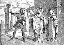 Padarn (Latin: Paternus, Padarnus; ? – c. 550 AD)[1] was an early 6th century sanctified British Christian abbot-bishop who founded St Padarn's Church in[2] Ceredigion, Wales. The first bishop of Braga and Saint Paternus of Avranches in Normandy appear to be the same person. Padarn built a monastery in Vannes and is considered one of the seven founding saints of Brittany. Padarn's early vita is one of five insular and two Breton saints' lives that mention King Arthur independently of Geoffrey of Monmouth's Historia Regum Britanniae.[3]