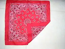 Through the 1970s, paisley bandanas were worn by many blue collar and labor workers to keep dust out of their mouths and noses. The bandana's symbolism once again shifted in American minds, being associated with hard work. Famous country singer Willie Nelson began wearing bandanas when he moved from Nashville back to Austin, Texas "just in time to catch the hippie wave cresting at counterculture center the Armadillo World Headquarters."[23] Around the same time, bandanas also became popular with motorcyclists, particularly with Harley Davidson riders and bikers." In the 1970s paisley bandanas also became popular amongst gangs in California, most notably with two well-known rival gangs, the Bloods who would wear red bandanas and the Crips who would wear blue bandanas.[24]