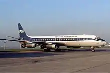In February 1960, PIA wet-leased a Boeing 707 from Pan American airlines and introduced it onto the Karachi-London route on 7 March 1960 initially using PanAm pilots,[8] thereby becoming the first Asian airline to induct and commercially operate a jet aircraft in its fleet.[8][9][11] - Air India took delivery of a 707 earlier on 21 February 1960, but did not induct the aircraft into commercial service until 19 April 1960.[25] An all-Pakistani crew began operation of the 707 from 20 June 1960 onwards.[20] By the end of 1960, PIA, for the first time, entered financial profitability.[20]