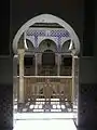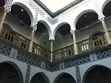 It is a fusion of several architectural styles, namely Moorish, Ottoman, Persian and European. The building consists of three floors with rectangle courtyard in the middle surrounded by suites, apartments, kitchens and hamams. Other facilities of the palace including two mosques, a diwan (public room), and an armory.[1][2] The building was decorated by the craftsmanship from Tunisia of the Islamic pottery, specifically the Hispano-Moresque ware originated from Andalucia and popularized in Tunisia in the 15th century.[2]