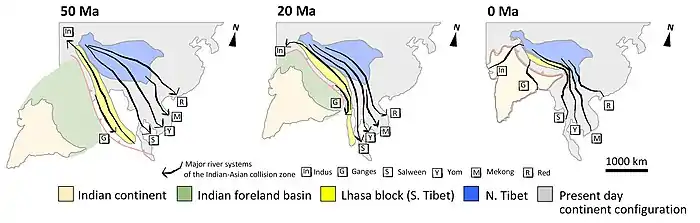 Brookfield (1998)[41] reconstructed the evolution of major river systems of the Indian-Asian collision zone based on tectonic history of the area. It is suggested that the most significant changes in drainage patterns occurred during Pliocene to Quaternary (5.3 Ma onwards). Detail changes in fluvial processes will not be discussed here. Major focuses are how river systems of the area responded to changing geological processes through time, as well as how regional drainage patterns are capable of reflecting tectonic evolution.[41]