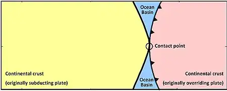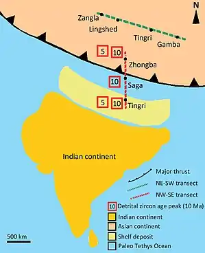 The onset of continental collision is determined by any point along the plate boundary where the oceanic lithosphere is completely subducted and two continental plates first come into contact.[4] In the case of the India–Asia collision, it would be defined by the first point of disappearance of the Neo-Tethys oceanic crust, where the India and Asia continent come into contact with each other. Such process is defined by a point since the shape of continental margins is irregular. The complete consumption of the oceanic crust could occur non-synchronously along the collision front.[5] Different methods can be used to constrain the age of collision onset. Commonly used geological evidences include stratigraphy, sedimentology and paleomagnetic data. Stratigraphy and sedimentology indicates the transfer of materials from one continent to another when two continents, meet, as well as the change in depositional environment after the oceanic basin is closed and sea water is completely expelled.[6] Paleomagnetic data indicates collision when the paleolatitudes of both continental margins overlap.[7]