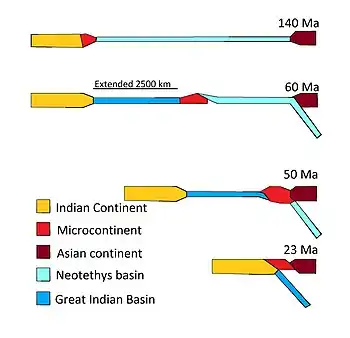 The Greater India Basin hypothesis suggests that there was a two-stage collision between India and Asia continent.[9] The first stage occurred at approximately 50 Ma, where a microcontinent from the Indian plate collided with the Asian continent.[9] It was followed by the subduction of the oceanic Great India Basin, which was located in between the microcontinent and the major Indian craton, under the Asian continent.[9] The second stage of collision occurred after the oceanic crust of the Great India Basin had been consumed, where the major Indian craton finally came into contact and collided with the Asian continental margin (including the previously "merged" microcontinent, which was interpreted to be the modern Tibetan Plateau) at 25–20 Ma.[9]