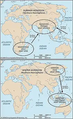 The South Asian monsoon system primarily affects the continents of South Asia and their surrounding water bodies. In this particular system, summer monsoon blows as onshore northeasterly while winter monsoon blows as offshore westerly. The driving force of monsoon systems is the pressure difference between landmasses and waterbodies. This is most commonly a result of differential heating of land and sea due to specific heat capacity difference. However, in the case of the South Asia monsoon system, the huge pressure gradient force is induced by the Himalayas and Tibetan Plateau. The Himalaya orogenic belt the highest elevated mountain range on Earth. In summer, air mass across the South Asia is heated up in general. On the contrary, airmass above the Himalayas and Tibet experiences adiabatic cooling and sinks rapidly, forming an intense high pressure cell. This cell is therefore capable of facilitating landward airflow towards itself, thus sustaining the onshore summer monsoon.[43]
