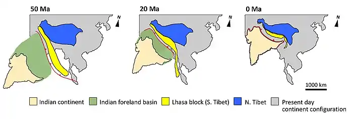 By the time when the Indian continent and the Asian continent collided, South Tibet has already reached 3–4 km elevation.[27][28][29][31] The compressional force resulted from the Indian-Asian collision further topped up Lhasa block's elevation and triggered crustal thickening in the North Tibet as the Indian continent proceed northwards.