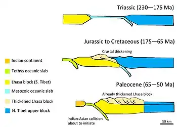 In the Mesozoic time, there was an oceanic basin in between the Lhasa block and the North Tibet continental block. Subduction of the oceanic slab underneath the North Tibet block started in the Triassic. In Jurassic to Cretaceous, the Mesozoic ocean is closed. The Lhasa continental block and the North Tibet continental block collided with each other, resulting in intense crustal shortening and thickening of the Lhasa block, i.e. South Tibet.[29] The closing of Mesozoic ocean, the continental collision between Lhasa block and North Tibet block and the early crustal thickening of Lhasa block is indicated by the presence of ultra-high pressure metamorphic rocks in the Qiangtang metamorphic belt in Central Tibet.[38]
