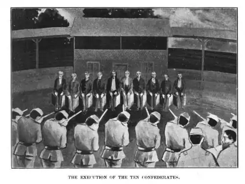A few minutes after 1 o'clock, Colonel Strachan, provost-marshal-general, and Reverend Rhodes shook hands with the prisoners, two of them accepting bandages for their eyes. All the rest refused. A hundred spectators had gathered around the amphitheater to witness the impressive scene. The stillness of death pervaded the place. The officer in command now stepped forward, and gave the word of command, "Ready, aim, fire." The discharges, however, were not made simultaneously, probably through want of a perfect previous understanding of the orders and of the time at which to fire. Two of the rebels fell backward upon their coffins and died instantly. Captain Sidner sprang forward and fell with his head toward the soldiers, his face upward, his hands clasped upon his breast and the left leg drawn half way up. He did not move again, but died immediately. He had requested the soldiers to aim at his heart, and they obeyed but too implicitly. The other seven were not killed outright, so the reserves were called in, who dispatched them with their revolvers.