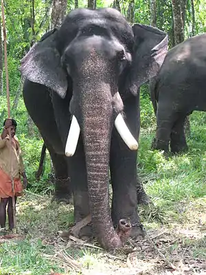 Pampady Rajan, who was born wild in the forests of Kerala was bought in the 1970s by Moodankallungal Baby at an auction from Kodanad elephant center for Rs 25,000.[2] Pampady Rajan has won many Gajapattams (elephant awards) including Gajarajan, Gajakesari, Gajarakthnam, Gajarajaprajapathi, Gajarajakulapathi, Gajaraja Lakshana Perumaal, GajarajaGajothama Thilakam, GajendraKarnan and a rare award named Gajamaanikyam.[3] On 21 October 2015, Rajan was honoured with a new title "Saarvabhauman Gajaraja Gandarvan" by Mahanavami committe in Kodunthirapully Village, Palakkad.[4] He is the winner of 2006 and 2007 Ithithanam Elephant Fest which was held at Changanassery in Kottayam district. He has participated in many poorams including the most famous Thrissur pooram.[5] Pambady Rajan is one of the celebrity elephants in Kerala.[6] Since elephants are chosen to carry images of deities at temple festivals based on their stature and bearing, he was one of four elephants featured in life-size advertisements on the highway for a temple in Maradu.[7] Some disputes are there regarding the exact height of Rajan. In a survey conducted on 27 February 2006 by the Forest Department to issue an ownership certificate, Rajan was measured a height of 315 cm. However in 2012, he was measured to be 308 cm.[8] However some claims that this was done by someone deliberately to show a reduction in his height.[9]