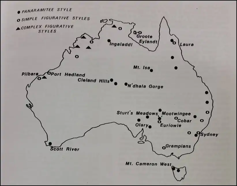 Not restricted to South Australia, these engravings have been found in central Australia, New South Wales, the Northern Territory, Queensland and Western Australia.[2] Figure 3[2] shows a map of Australia with black dots indicating recorded Panaramitee-style sites.