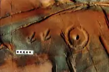 The Panaramitee Style has been argued to be over seven thousand years old based on archaeological dating techniques, anthropological research, the recent occurrence of geographic barriers and animal tracks which possibly portray extinct megafauna.[2] Rock art is notoriously difficult to accurately date with very few examples of stratigraphic association which are conclusively related to the artwork (Mulvaney and Kamminga 1999:367). However, it has been long assumed that the Panaramitee Style is very old based on Basedow’s aforementioned early publication. He justified a Pleistocene age by using four main arguments (1) petroglyphs located at two sites are inaccessible because of vertical erosion (2) detached painted rock on the valley floor, the other part of the design situated high on the rock face (3) dark patina covering the petroglyphs (4) speculated megafauna tracks, said to reflect extinct diprotodon prints.[5] This was furthered by later claims from Norman Tindale suggesting genyornis and procoptodon tracks near Yunta Springs and reports from Charles P. Mountford that a saltwater crocodile was depicted at Panaramitee station.[5] Since the extinction of most megafauna transpired at least 20,000 years ago and the extinction of saltwater crocodiles in this region millions of years ago, these speculations would suggest a very late antiquity.[1]