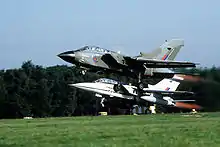 In development, significant attention was given to the Tornado's short-field take-off and landing (STOL) performance. Germany, in particular, encouraged this design aspect.[64] For shorter take-off and landing distances, the Tornado can sweep its wings forwards to the 25-degree position, and deploy its full-span flaps and leading edge slats to allow the aircraft to fly at slower speeds.[65] These features, in combination with the thrust reverser-equipped engines, give the Tornado excellent low-speed handling and landing characteristics.[66]