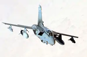 Italian Tornados, along with RAF Tornados, took part in the first Gulf War in 1991. Operation Locusta saw eight Tornado IDS interdictors deployed from Gioia del Colle, Italy, to Al Dhafra, Abu Dhabi, as a part of Italy's contribution to the coalition.[167] During the conflict, one aircraft was lost to Iraqi anti-aircraft fire, the pilots ejected safely and were captured by Iraqi forces.[168] A total of 22 Italian Tornados were deployed in the NATO-organised Operation Allied Force over Kosovo in 1999, the A-200s served in the bombing role while the EA-200s patrolled the combat region, acting to suppress enemy anti-aircraft radars,[169] firing 115 AGM-88 HARM missiles.[170]