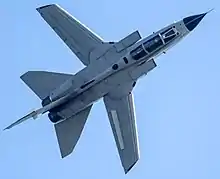 The Tornado is cleared to carry the majority of air-launched weapons in the NATO inventory, including various unguided and laser-guided bombs, anti-ship and anti-radiation missiles, as well as specialised weapons such as anti-personnel mines and anti-runway munitions.[84][85][86] To improve survivability in combat, the Tornado is equipped with onboard countermeasures, ranging from flare and chaff dispensers to electronic countermeasure pods that can be mounted under the wings.[87] Underwing fuel tanks and a buddy store aerial refuelling system that allows one Tornado to refuel another are available to extend the aircraft's range.[88]