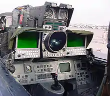 The primary flight controls of the Tornado are a fly-by-wire hybrid, consisting of an analogue quadruplex Command and Stability Augmentation System (CSAS) connected to a digital Autopilot & Flight Director System (AFDS).[70] In addition a level of mechanical reversion capacity was retained to safeguard against potential failure.[71] To enhance pilot awareness, artificial feel was built into the flight controls, such as the centrally located stick. Because the Tornado's variable wings enable the aircraft to drastically alter its flight envelope, the artificial responses adjust automatically to wing profile changes and other changes to flight attitude.[72] As a large variety of munitions and stores can be outfitted, the resulting changes to the aircraft's flight dynamics are routinely compensated for by the flight stability system.[73]