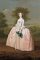 The earlier form of the pannier took the shape similar to a 19th-century crinoline. They were wide and domed in circumference.[1] As they developed, they differed from earlier equivalents such as the farthingale of the late 16th century, by not extending equally in all directions, but being very wide at the sides, but not coming out so far to front and back. By the mid-century, the "shoulders" were rather abrupt, not gently curved.