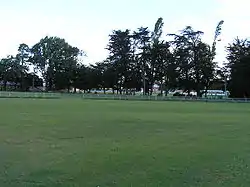 St James Park was originally 'glebe land' belonging to St Paul's church and was divorced from the main church property by the laying of the Main North Railway line in the early 1870s. It is believed to have been farmed by James Triggs, the St Paul's Church verger,[30] and part of it was developed as a cricket ground by the Papanui Cricket Club under the captaincy of John Matson with the permission of Rev. Lorenzo Moore. By 1874 the new incumbent at St Paul's, the Rev Brittan, had joined the Cricket Club as a player, but had also leased some of the land to Mr Jackson, another club member, for stock grazing. The land appears in an 1880 map as a cricket ground,[31] but was later abandoned by the cricket club and sold to Ivorys Cool Stores in 1916. The land was purchased by the City in 1924 after residents, led by Rev Griffin, petitioned the council for a park and has both main entrances sited on St James Avenue. It was named in a Public Notice drawn up by the Christchurch City Council Bylaws and Finance committee chaired by Councilor Andrews on 30 April 1924.[32] Rev Griffin did not live to see the park opened, and as a mark of respect Memorial Gates and a rose garden we jointly funded by the residents and the Council in his honour.