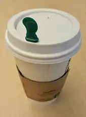 Hot drinks sold in paper cups may come with a plastic lid, to keep the drink hot and prevent spillage. These lids have a hole through which the drink can be sipped. The plastic lids can have many features including peel back tabs, raised walls to protect the foam of gourmet hot drinks and embossed text.[31] In 2008, Starbucks introduced shaped plastic "splash sticks" to block the hole, in some of their stores, after customer complaints about hot coffee splashing through it.[32][33]