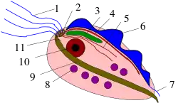 Parabasalids are anaerobic, and lack mitochondria, but this is now known to be a result of secondary loss, and they contain small hydrogenosomes which apparently developed from reduced mitochondria.[2] Similar relics have been found in other amitochondriate flagellates, and the parabasalids are probably related to them, forming a group called the metamonads. They lack the feeding grooves found in most others, but this is probably a secondary loss as well.