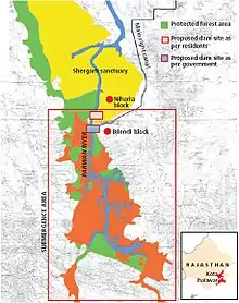 The dam to be built 120 km from Kota town in Akawad village of Jhalawar district was likely to submerge 10,000 hectares (ha), including more than 1,600 ha of forestland. The union Ministry of Environment and Forests (MoEF) granted environmental clearance to the project in November, 2011. The clearance letter states the dam will completely submerge 17 villages and partially inundate 30 villages, affecting over 3,000 families including 461 tribal families.[5]