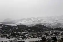 Average precipitation at Parinacota is about 440 millimetres per year (17 in/year).[22] Between about 12 and 26° degrees southern latitude, most of the moisture that arrives was absorbed by winds over the Amazon and transported to the Andes. Thus, humidity increases from west to east,[105] with the Pacific coastline being particularly dry.[106] Parinacota lies within the puna seca climate region,[107] where precipitation occurs over 7 or 8 months of wet season and results in a total amount of 500–250 millimetres per year (19.7–9.8 in/year),[105] most of it falling during the summer months when the Altiplano warms up under the sun, generating a monsoon-like wind current.[108] The summer precipitation is also known as the "Bolivian winter" or "Altiplanic winter".[106] This is an unusual precipitation pattern for Chile; most of the country has a mediterranean climate where most precipitation occurs during the winter months.[109]