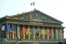 - 6 January 2005: several monuments and bridges of Paris are lit with the colours of the Olympic rings (green, yellow, red and blue) in honour of the Parisian candidacy: Palais Bourbon which lodges the National Assembly (left bank), Paris City Hall (right bank), the Eiffel Tower, and four bridges of the Seine Marie Bridge, Bridge of the Harmony, Michaelmas Bridge and footbridge Debilly will display the logo of Paris 2012 until 6 July 2005.