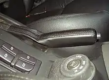 In road vehicles, the parking brake, also known as a hand brake or emergency brake (e-brake),[1] is a mechanism used to keep the vehicle securely motionless when parked. Historically, it was also used to help perform an emergency stop should the main hydraulic brakes fail.[2] Parking brakes often consist of a cable connected to two wheel brakes, which is then connected to a pulling mechanism. In most vehicles, the parking brake operates only on the rear wheels,[3] which have reduced traction while braking. The mechanism may be a hand-operated lever, a straight pull handle located near the steering column or a foot-operated pedal located with the other pedals.
