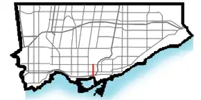 Parliament Street begins at Queen's Quay, close to the lake shore and Toronto Harbour in an area once the centre of Toronto industry but now largely abandoned. North of the Gardiner Expressway, Parliament marks the eastern border of the St. Lawrence neighbourhood, a former industrial area that has been redeveloped as mixed-income and mixed-use community following the precepts of Jane Jacobs.[4] To the east of Parliament is the Distillery District, a cluster of Victorian industrial buildings that have been converted into a commercial and cultural centre.[5]