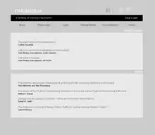 Parrhesia: A Journal of Critical Philosophy is an international open-access journal of Critical Philosophy affiliated with Melbourne School of Continental Philosophy. It is edited by four MSCP members: Alex Murray, Matthew Sharpe, Jon Roffe and Ashley Woodward.[1][2] It was launched in 2006 and has included articles by Alain Badiou[3][4] and Jacques Rancière.[5]