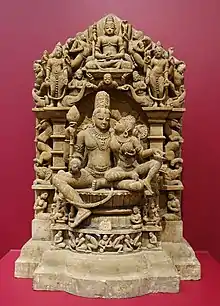 The couple is often depicted in the Puranas as engaged in "dalliance" or seated on Mount Kailash debating concepts in Hindu theology. They are also depicted as quarreling.[58] In stories of the birth of Kartikeya, the couple is described as love-making; generating the seed of Shiva. Parvati's union with Shiva symbolizes the union of a male and female in "ecstasy and sexual bliss".[59] In art, Parvati is depicted seated on Shiva's knee or standing beside him (together the couple is referred to as Uma-Maheshvara or Hara-Gauri) or as Annapurna (the goddess of grain) giving alms to Shiva.[60]