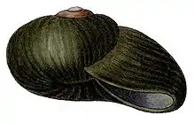 The shell is large, broadly umbilicated, depressed and subdiscoidal. The shell is opaque and shining. The colour is deep green, usually with some radial streaks of blackish-green.[3]