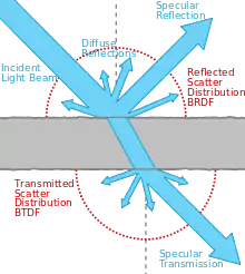The reflective properties (amount, direction and colour) of surfaces are modelled using BRDFs. The equivalent for transmitted light (light that goes through the object) are BSDFs. A path tracer can take full advantage of complex, carefully modelled or measured distribution functions, which controls the appearance ("material", "texture" or "shading" in computer graphics terms) of an object.