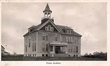 The town was named for Amos Patten,[5][6] a resident of Bangor, Maine, who about 1828 purchased Township No. 4, Range 6, as it was then designated, for its vast timber supply.[7][8] In 1829 Amos Patten hired Ira Fish and Eli Kellogg to survey the land.[8] The surveyors soon asked permission to establish their homes in Patten. The town was incorporated on April 16, 1841 and given its present name at that time.[9] By 1850 the population numbered 470, reaching 704 in 1870, and 716 residents in 1880.[9] The town's infrastructure gradually appeared. In March, 1841 the Congregational Church was organized.[10] Within a few years, citizens began agitating for local education. A bill to appoint Trustees of the Patten Academy passed the Maine legislature and was signed by the governor in 1847.[11] The Patten Academy opened its doors with 61 students in September, 1848, and educated its residents for more than a century.