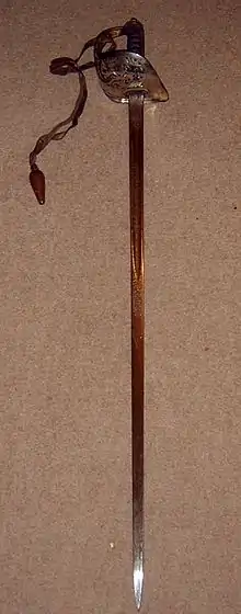 By the time of its introduction, the sword was of limited use on the battlefield against rapid-firing rifles, machine guns and long-range artillery. However, the new sword was regarded, when needed, as a very effective fighting weapon. Reports from the Sudan, where it was used in close-quarters fighting during the reconquest of the Sudan (1896-'99) were positive. Officers carried swords into battle in 1914 at the start of the First World War, and some were still being used in action at the Battle of Neuve Chapelle in March 1915. That June, Army Order 68 prohibited the carrying of swords by infantry on the battlefields of the European theater of the war, in an effort to prevent officers making themselves conspicuous to the enemy; however, at least one sword was carried in the assault on the first day of the Battle of the Somme in June 1916.[2] Bernard Montgomery advanced with his 1897 pattern sword drawn during a counteroffensive in October 1914; having never received any training on how to use it.[3] The actual sword he carried is exhibited in the Imperial War Museum, London.