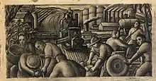Meltsner's 1937 mural, Ohio, in the Bellevue, Ohio post office, depicted a heroic scene of laboring Ohio farmers and factory workers and remains an exemplary specimen of the mural work that was awarded by the Department of the Treasury's Section of Painting and Sculpture.[5][6]