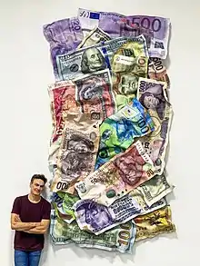 In 2010 Rousso gained access to a new digital printing technology which employed a heat-to-print method on sheets of vinyl up to 4-by-8 feet. He realized these vinyl prints could then be applied directly to plexiglass, which could then be heated and sculpted. With these innovations, Rousso was able to create his first currency piece, a one hundred dollar bill, measuring approximately six feet by four.[15] The currency piece was originally produced as a personal work and Rousso left it to languish on his studio floor for months, until a friend saw it and suggested that if he could hang it on the wall, he might have something. Not imagining the work as a wall piece the artist devised a way to hang it and had it photographed. The photograph was posted to Facebook by his wife, Joy, with the comment "My husband finally learned how to make big money". An artist associate Cecil Touchon saw it and sent it to his gallerist in Miami, Robert Fontaine. Fontaine called Rousso and told him that if he could deliver a couple to Miami within the week, he would show them at SCOPE Art Show. Rousso delivered five works of sculpted currency[3] and the Robert Fontaine Gallery would be the first to display Rousso's work at a major art fair in 2011.[16]