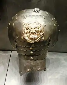 A pauldron (sometimes spelled pouldron or powldron) is a component of plate armor that evolved from spaulders in the 15th century. As with spaulders, pauldrons cover the shoulder area.[1] Pauldrons tend to be larger than spaulders, covering the armpit, and sometimes parts of the back and chest. A pauldron typically consists of a single large dome-shaped piece to cover the shoulder (the "cop") with multiple lames attached to it, to defend the arm and upper shoulder. On some suits of armour, especially those of Italian design, the pauldrons would usually be asymmetrical, with one pauldron covering less (for mobility) and sporting a cut-away to make room for a lance rest.[2]