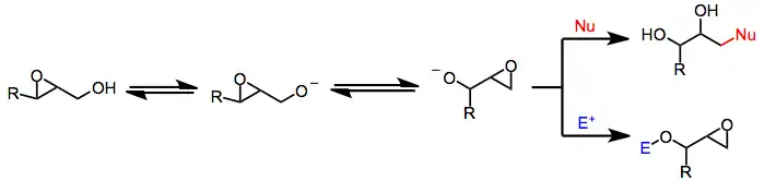 Under basic, protic conditions, 2,3-epoxy alcohols undergo a rearrangement in which the alcohol oxygen opens the epoxide with inversion of configuration, forming an isomeric 1,2-epoxy alcohol. Overall, the Payne rearrangement represents a migration of the epoxide. Although the migration itself is fully reversible, nucleophilic opening under Curtin–Hammett conditions provides good yields of functionalized diols derived from a single epoxy alcohol isomer.[2] Intramolecular electrophilic trapping of the new alkoxide generated upon rearrangement may also be used to drive the reaction to completion. In some cases, the thermodynamic difference between epoxide isomers is large enough to obtain a single isomer in synthetically useful yield without relying on kinetic differences associated with trapping.