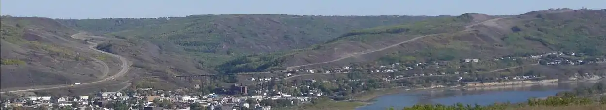 The specific landform in which the town is situated is the Peace River Lowland which was incised by the Peace River and its tributaries right through the area's former glacial lake sediments and into the Cretaceous bedrock.[23] The Peace River Lowlands is flanked by the Buffalo Head Hills to the east and the Whitemud and Clear Hills to the west.