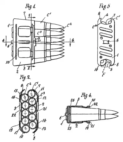 - An asymmetrical spring steel clip of ten rounds in a double-staggered column would then be inserted, feed end up, into the magazine against the spring pressure of the magazine follower; when fully inserted the clip would be caught and held by a catch. (Note: this clip, like the clip used in the Austrian Model 95 rifle, could only be inserted one way and thus could potentially cause confusion under the stress of combat). Unloading the magazine would be done by (if necessary) retracting and holding open the breech mechanism, then pushing the trigger forward from its neutral position; the clip and any remaining cartridges would be ejected upward.