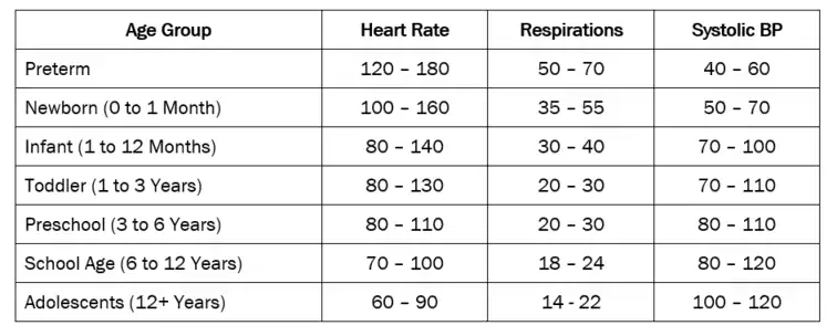 Pediatric patients' -- infancy to adolescence—vital parameters vary by each age group and are different than an adult's healthy range. When reviewing vital signs in each of the age groups, be alert for significant changes and compare with normal values for each of the signs. For best results, when taking vital signs of infants, respirations are counted first before the infant is disturbed, the pulse next, temperature, and then blood pressure last.