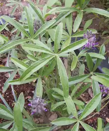 It has an inflorescence on stems 5-6 centimeters long, separate from the leaves, arising from a subterranean stem and deep carrot-shaped root that is 3–7 cm long. The long petioled leaves are palmately divided into 5 linear-elliptic leaflets that are 3-5 centimeters long. The flowers, borne in condensed spikes separate from the leaves, are purple and pea-like, and have a surprisingly strong scent, reminiscent of lemon furniture polish. The species has edible tuberous roots, high in protein.