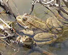 | Mating pool frogs (Pelophylax lessonae) Male above, female below | |