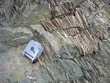 Pencil cleavage in geology refers to a cleavage in rock such that long, slender, pencil-shaped fragments of rock are created by fracturing during the weathering of a sedimentary rock. Pencil cleavage is usually associated with rock units that contain high angle of intersection between cleavages, such as a diagenetic cleavage and a later tectonic cleavage.[1]